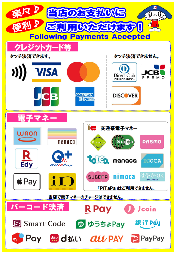 今月から細かなQRコード決済も全て取扱い出来るようになりました。
