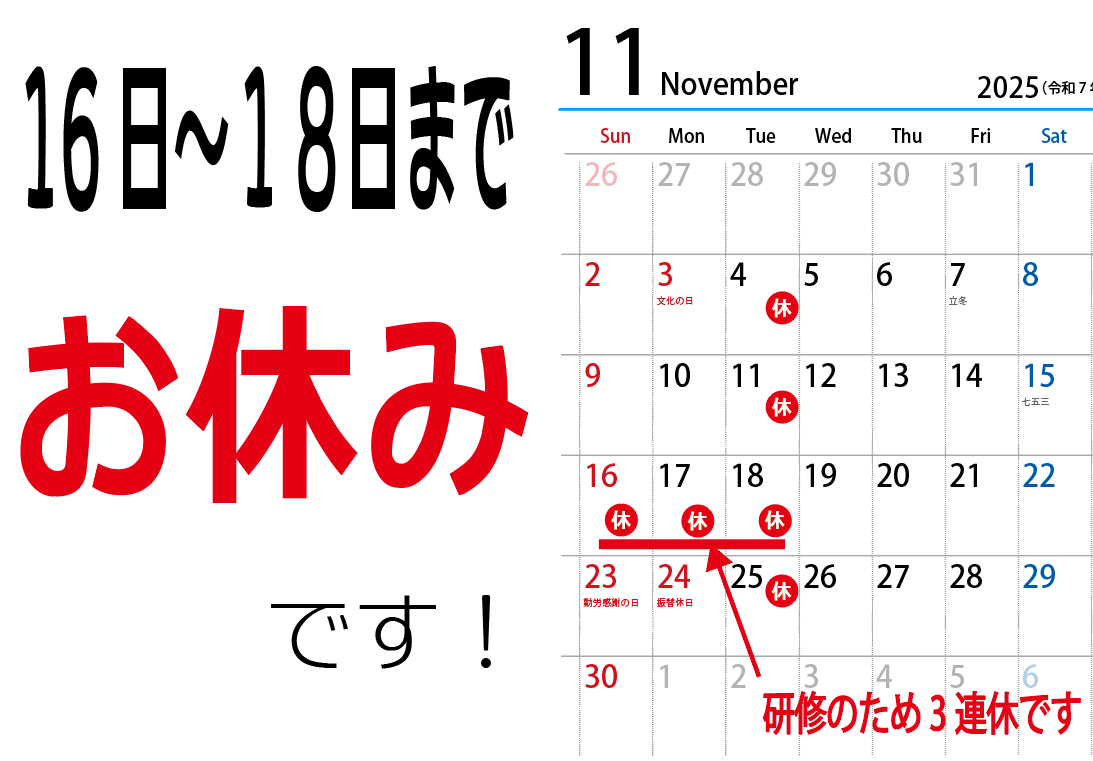 お店情報2025.11.1616日(日)~18日(火)までお店お休みします。 ポスト シェア 送る Pocket 【11月16日(日)~18日(火)まで休みます!!】 店舗視察研修のため、頑張って勉強してきます!! ※水曜日から通常通りの営業ですので、よろしくお願いします。